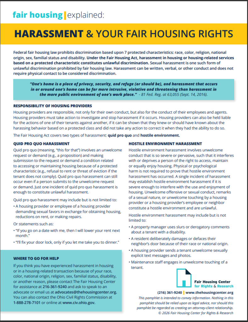 At the Fair Housing Center for Rights & Research, we want to make it easy for you to understand your rights and responsibilities under fair housing law. That’s why we regularly develop and distribute fair housing resources, which are available for free download. Organizations can also request to receive physical copies of our resources by sending a message to education@thehousingcenter.org.